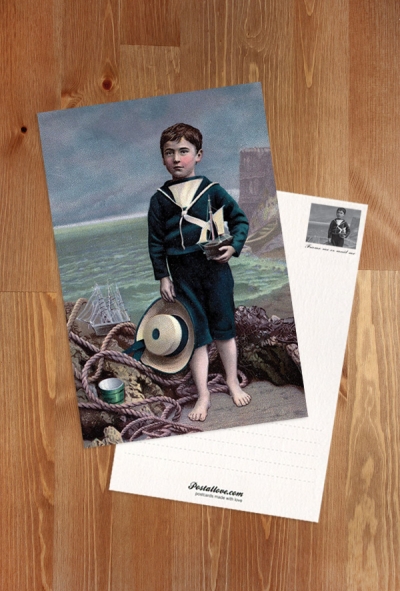 Wyślij pocztówkę pełną uroku z wzorem 'Mały marynarz'. Ta nostalgiczna ilustracja młodego marynarza przenosi w świat morskich przygód i marzeń. Wydrukowana na wysokiej jakości kartonie, doskonale sprawdzi się zarówno w kolekcji, jak i do wysyłki wyjątkowych wiadomości. Idealna dla miłośników Postcrossingu, kolekcjonerów i wszystkich ceniących tradycyjną korespondencję. Wprowadź odrobinę vintage do swojej skrzynki pocztowej z tą wyjątkową kartką.
