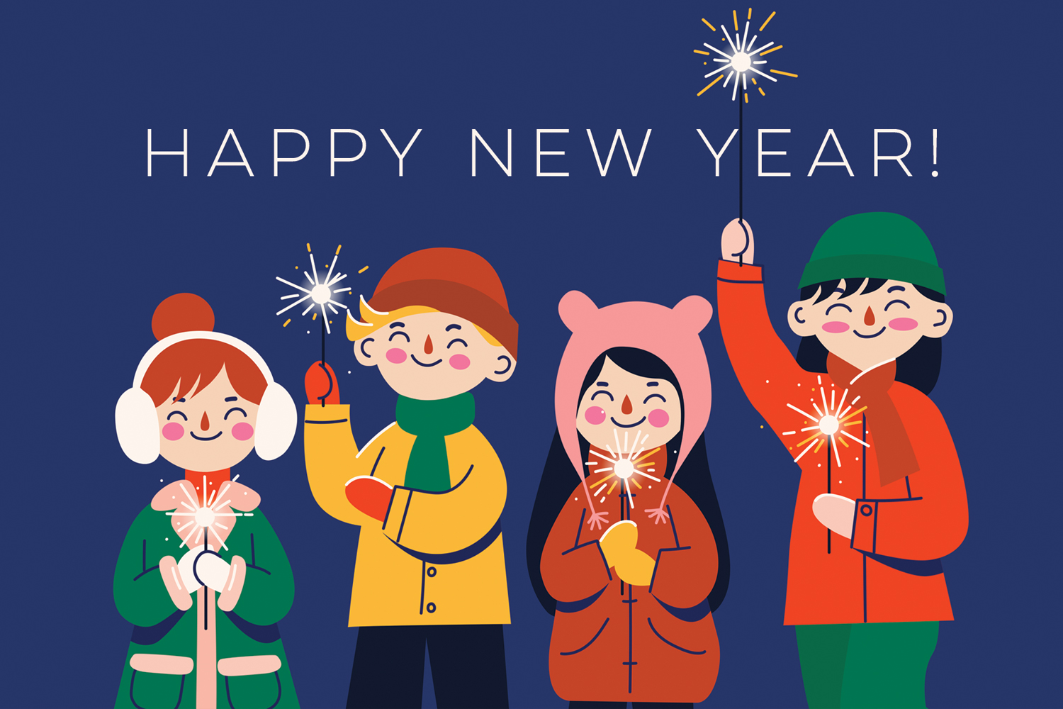 Przywitaj Nowy Rok z iskrą radości. Ilustracja przedstawia czwórkę osób w zimowych kurtkach, trzymających zimne ognie pod granatowym niebem z napisem “HAPPY NEW YEAR!”. To pogodny, energetyczny motyw, który pięknie współgra ze świątecznymi znaczkami, taśmą washi i krótką, osobistą wiadomością. Idealna na Postcrossing, wymiany i życzenia dla bliskich na całym świecie. Wyślij ją, by opowiedzieć o swoich noworocznych zwyczajach, planach czy małych radościach na nadchodzący rok i rozjaśnić zimowe dni.